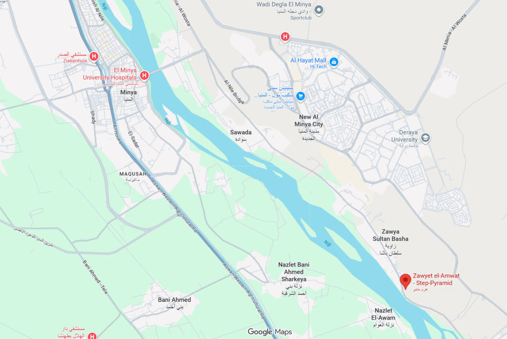You can find the archaeological site Zawyet Sultan just to the south of the modern village of the same name, some eight kilometres upstream from the modern city of el-Minya, on the East bank of the Nile. It is easiest to reach by taking the new highway that passes through New Minya (also located on the East side of the Nile).