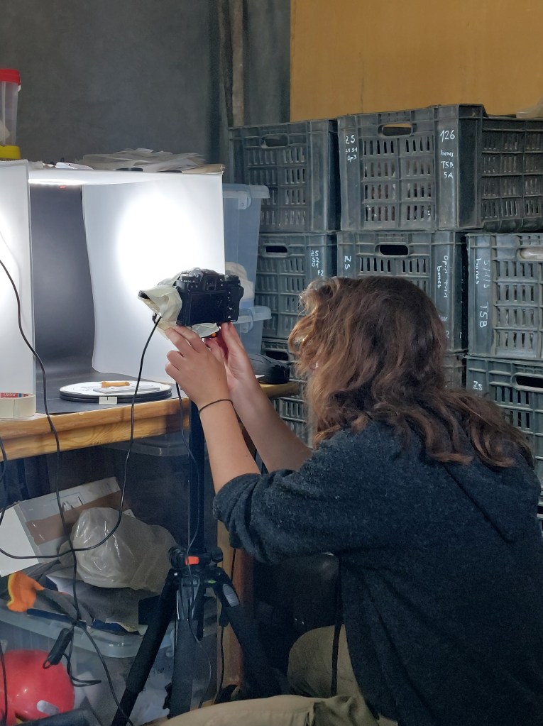 Our Osteologist Pia Lorenz photographs a finger bone in order to reconstruct routine activities of the inhabitants of ancient Hebenu.